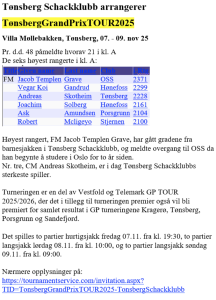 Fra Tønsberg SK kom 18, Håvard Skotheim 1513, 3.0 p, og 34, Terje Kristiansen 1576, 0.0 p.