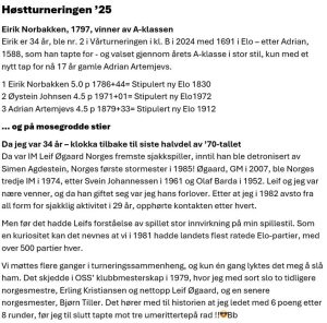 ble spilt med alle i samme klasse, 30 deltagere, og ble forskriftsmessig vunnet av vår CM, Andreas Skotheim, med 14 p, på 15 runder. Formann John Rune Alfredsen kom på 2. plass med 11.5 p. og Vebjørn Maanum Leonhardsen på 3. med 10.5 p.